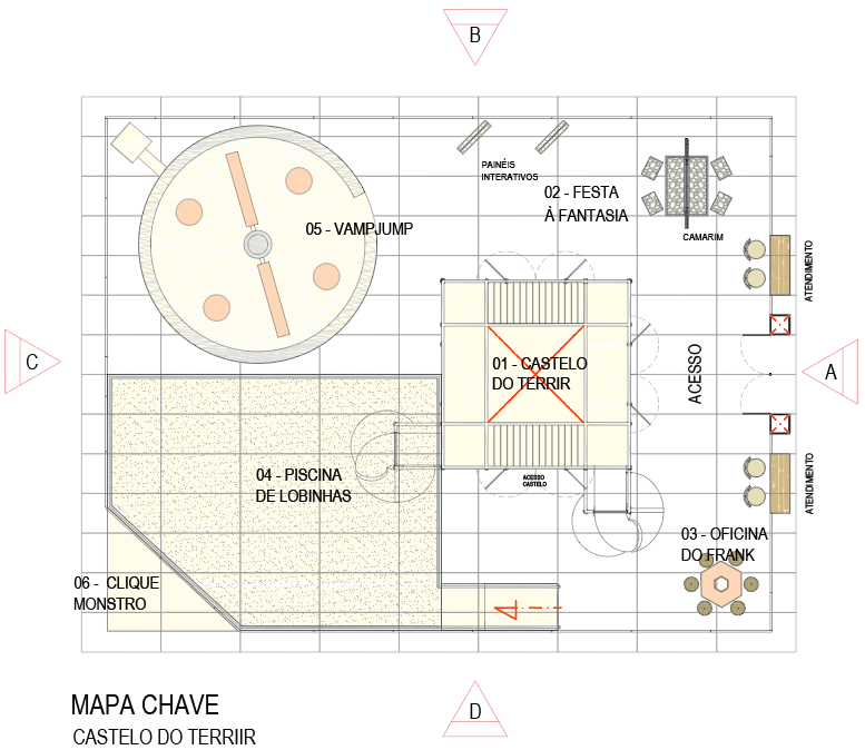Na parte interna do Castelo uma estrutura de kid play proporciona a escalada até a saída do escorregador rotomoldado. Na parte externa são mais 5 estações com diferentes atividades: Festa a Fantasmia. Oficina do Frank, Clique Monstro, Piscina de Lobinhas e Vamp Jump. Essas estações podem ou não ser montadas, de acordo com os espaços disponíveis para operação.