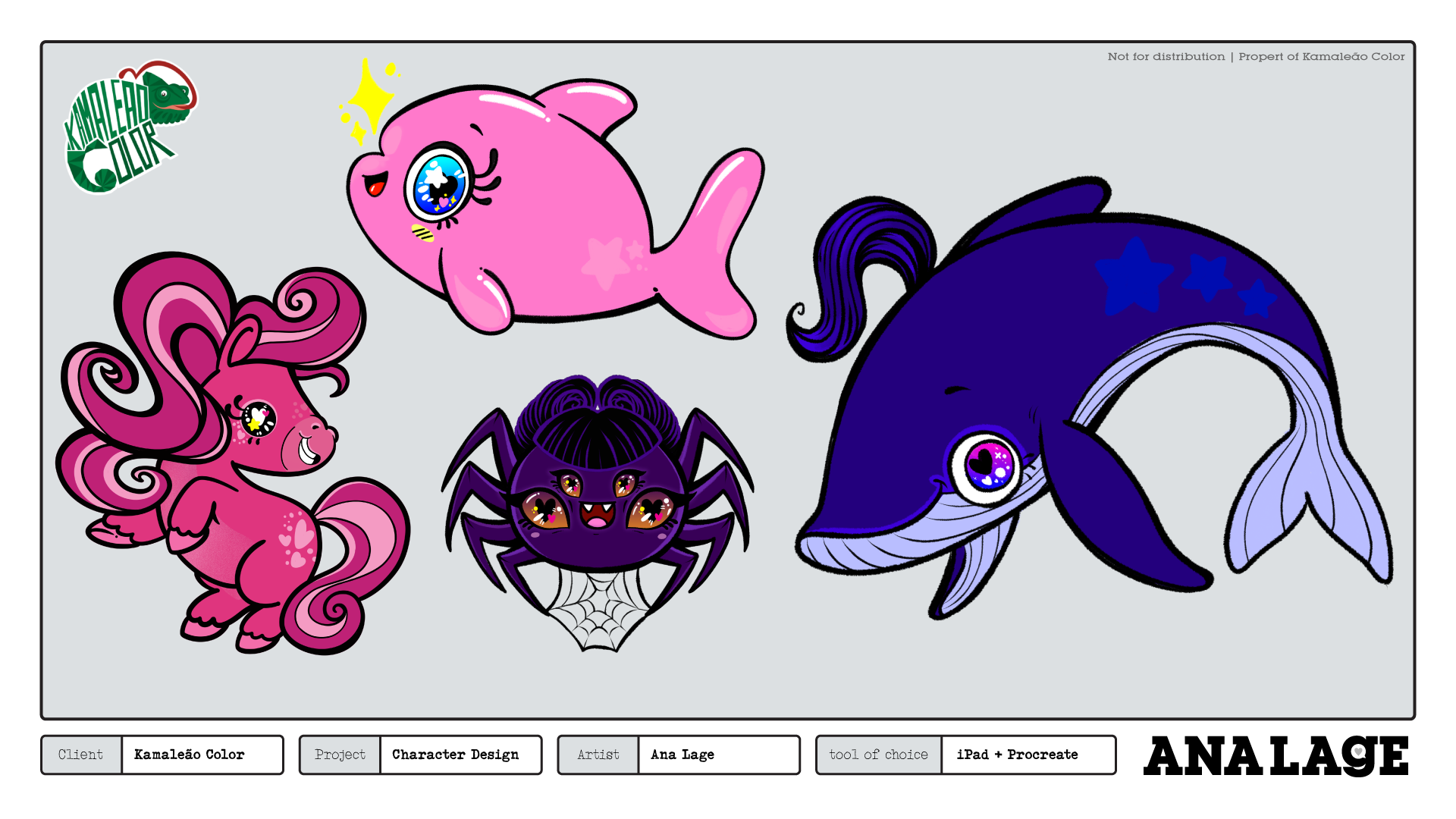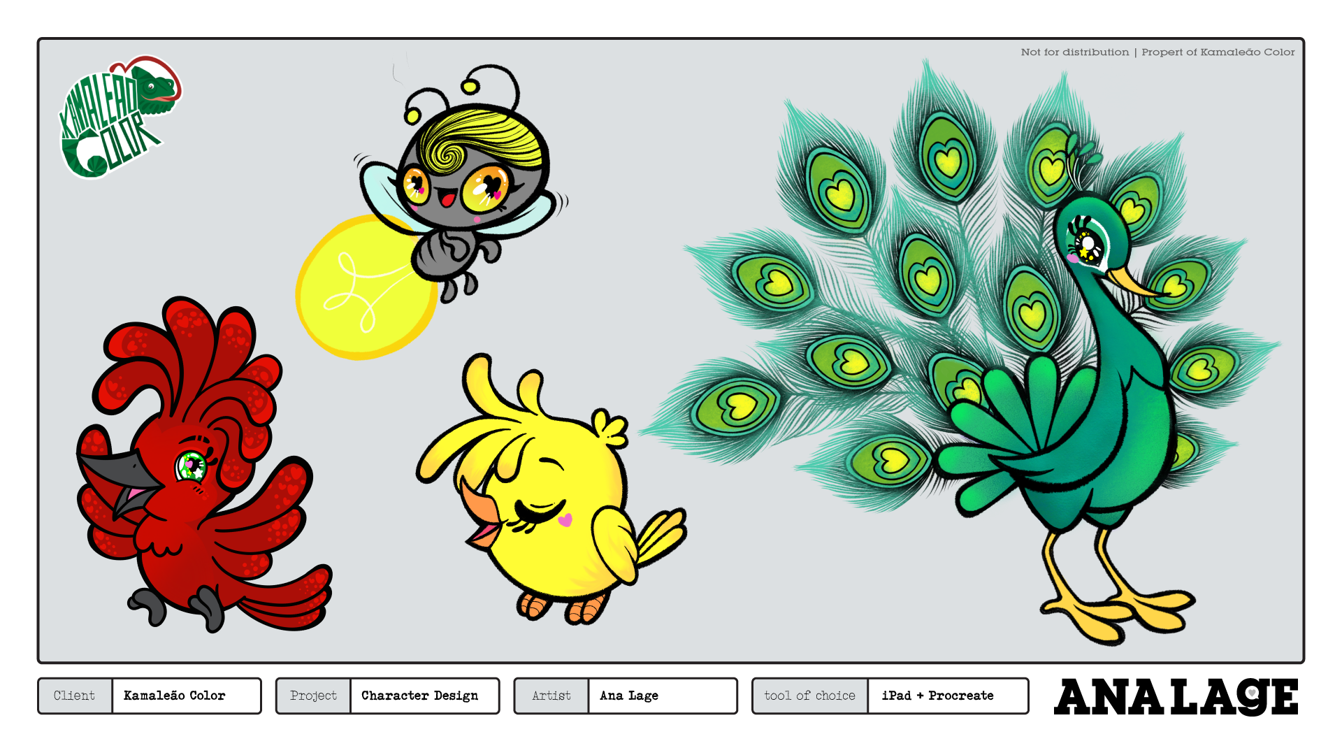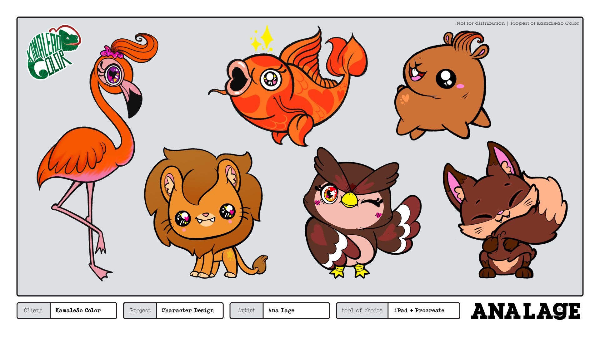Character designs I did for hair dye brazilian brand called Kamaleão Color. They wanted some really kawaii animals, each one representing one color.